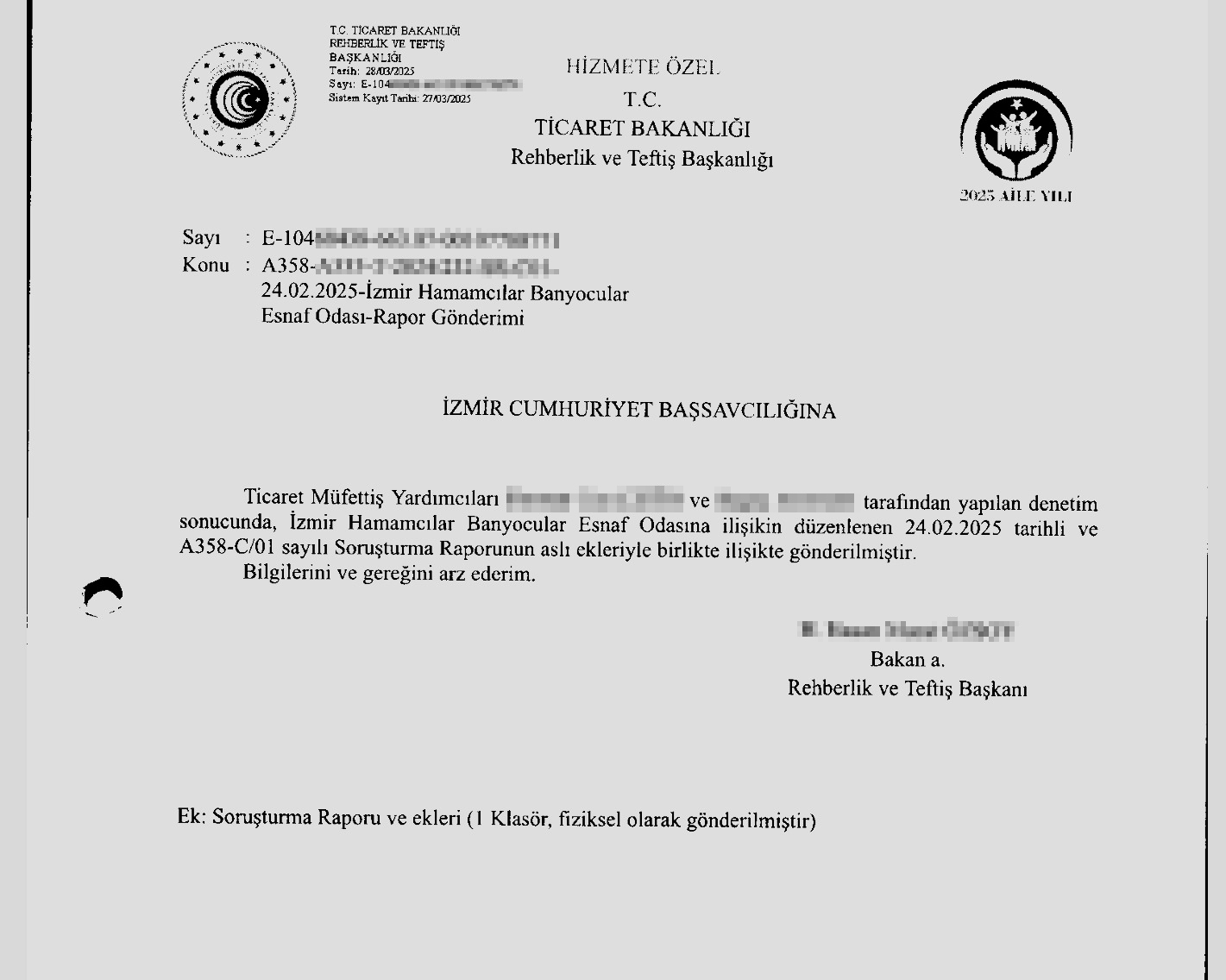 İzmir Hamamcılar Banyocular Esnaf Odası bu müfettiş raporuyla tarihe bir meslek örgütü değil, yolsuzluğun kurumsallaştığı bir utanç vesikası olarak geçti.