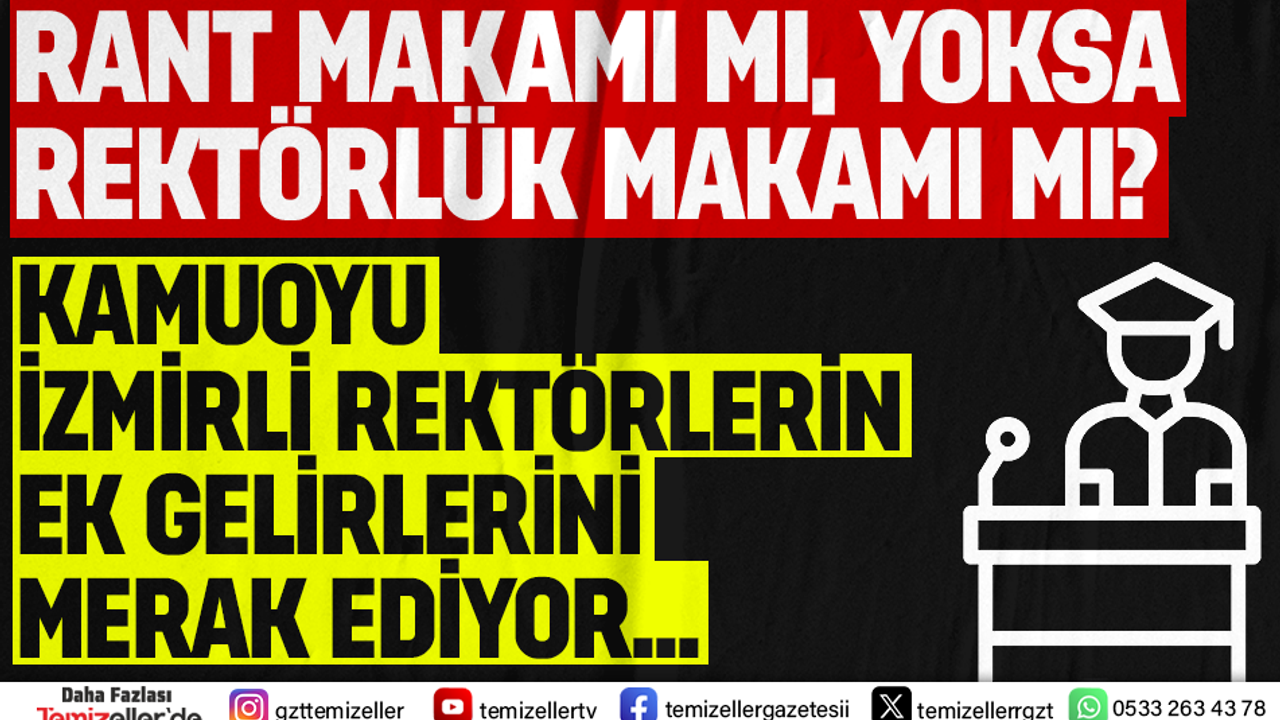 İzmir’deki rektörlerin şimdi çıkıp konuşma vakti gelmiştir. Ya şeffaflıkla, onurla ve hesap vererek bu görevleri sürdürecekler, ya da aldıkları maaş haricindeki ek gelirleri ve şatafatlı makam saltanatlarını her hafta bir Rektörü TEMİZELLER kamuoyuna açıklayacak.
