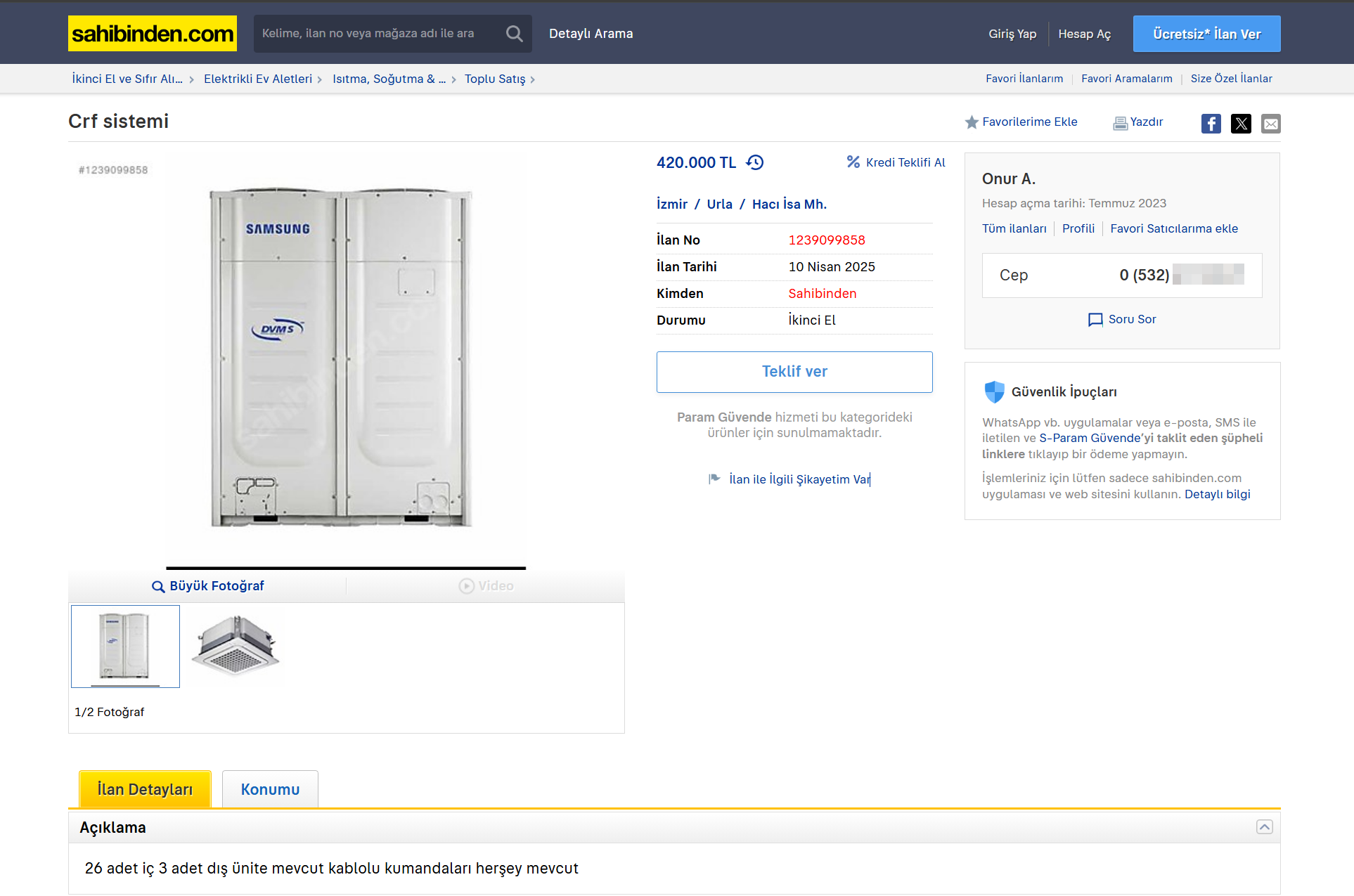 Temizeller Gazetesi’nin belgeleriyle ortaya koyduğu üzere, okulun demirbaşına kayıtlı CRF marka iklimlendirme sistemi, Onur Ayaz tarafından 10 Nisan 2025 tarihinde 420 bin TL bedelle sahibinden.com üzerinden satışa çıkarılmıştı.
