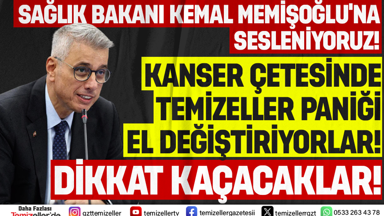 İzmir’de kanser çetesi ile ilgili bu sıcak gelişmeler üzerine TEMİZELLER, Sağlık Bakanı ve diğer üt düzey bürokratlara tarihi bir çağrıyı yapmayı görev biliyor. Sağlık Bakanı Kemal Memişoğlu iddialar sadece birer dedikodu değil. Kulis bilgileriyle sınırlı bilgiler de değil. Bu bilgiler sahadan gelen bilgiler, hızla atılan adımlar ve panik hali, kaçış girişimlerinin başladığını gösteriyor. Eğer bu çete uzantılarının kaçmasını önlemek için adımlar atılmazsa yarın çok geç olabilir. Deliller uçar, dosyalar kapanır, sorumlular yurtdışına kaçar.