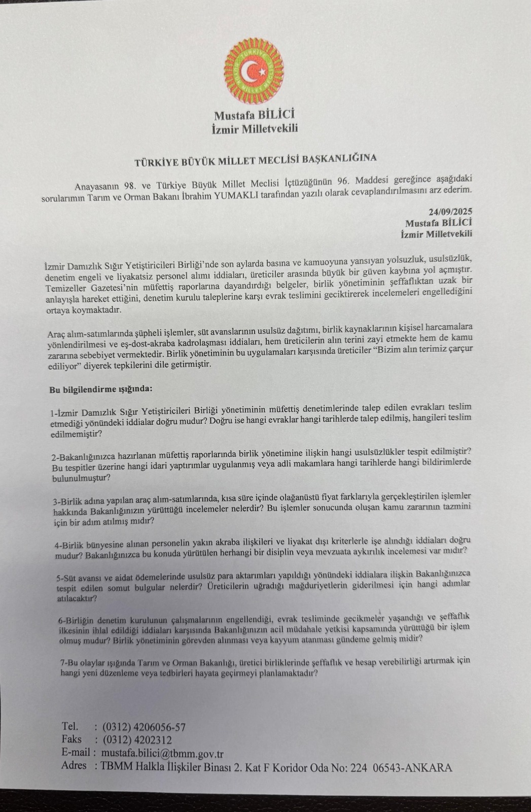 Özellikle birlik yönetiminin kaybettirdiği “1. Sınıf Tarımsal Örgüt” statüsü ve kamu zararına yol açan işlemlerle ilgili kamuoyuna sunulan belgeler, artık sadece İzmir’de değil, TBMM çatısı altında da yankı buldu. Temizeller ’in ortaya koyduğu gerçekler doğrultusunda, İzmir Milletvekili Mustafa Bilici’nin 15.000 üreticinin sesi olarak Tarım ve Orman Bakanı İbrahim Yumaklı’nın yazılı olarak yanıtlaması istemiyle yedi maddelik kapsamlı bir soru önergesi vererek “Üretici Sahipsiz Değil!" mesajı verdi.